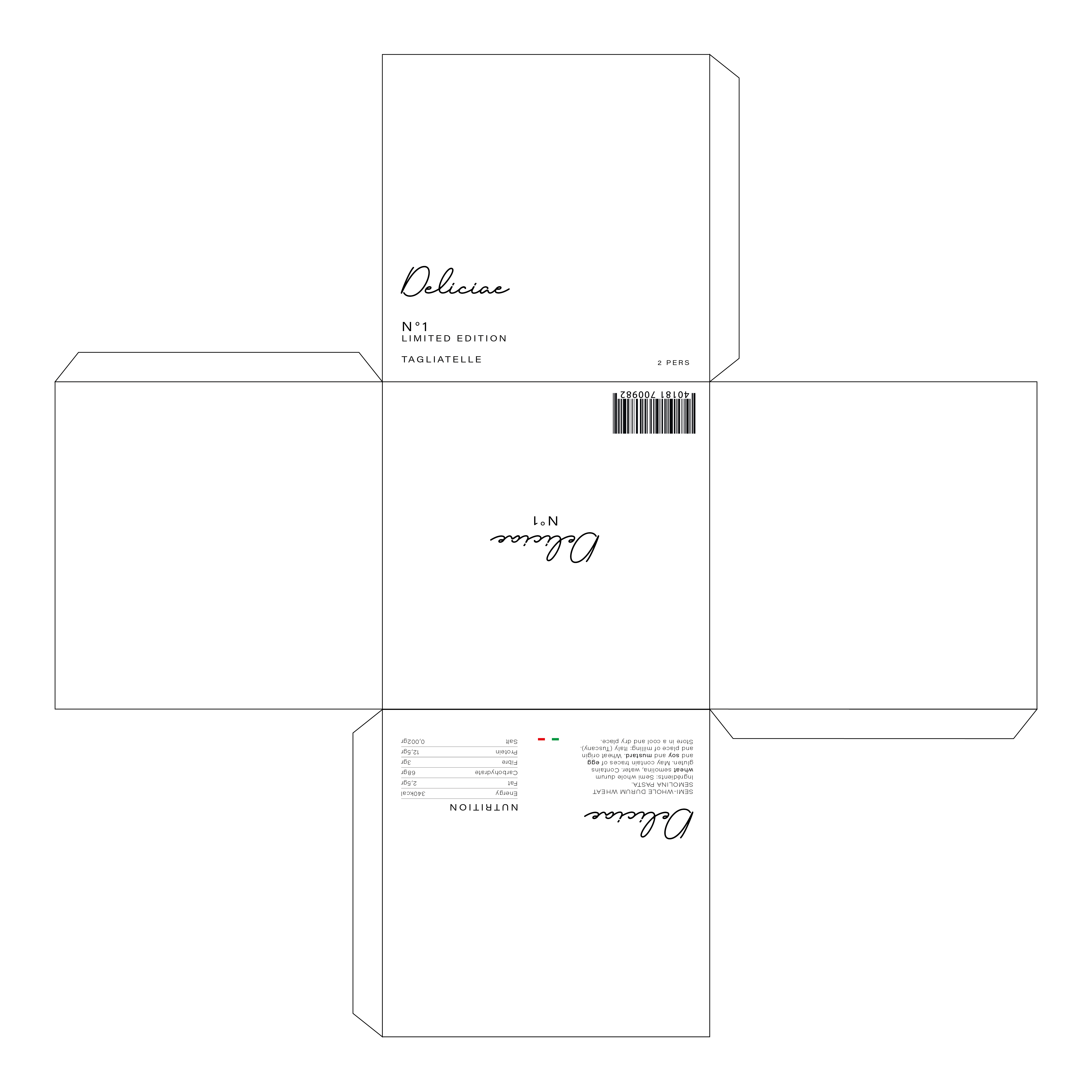 Conception d’un packaging corporate très haut de gamme, pour une marque de pâtes “DELICIAE”.